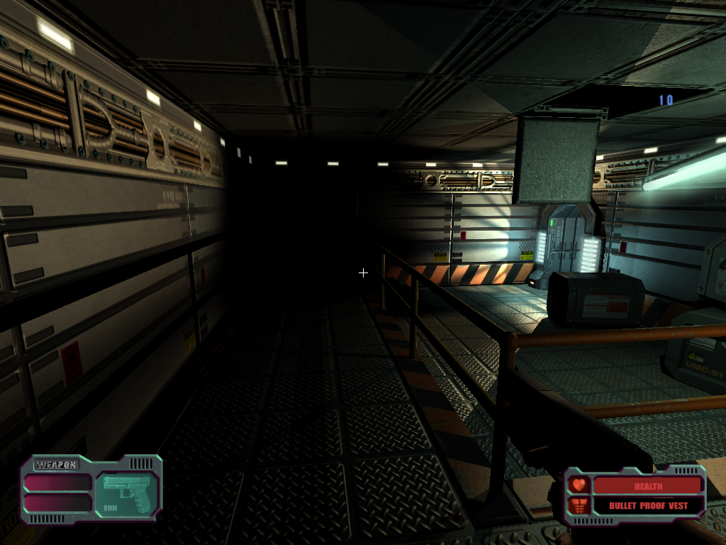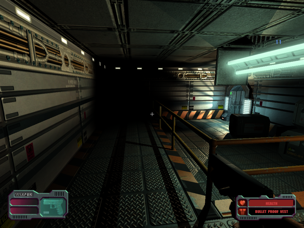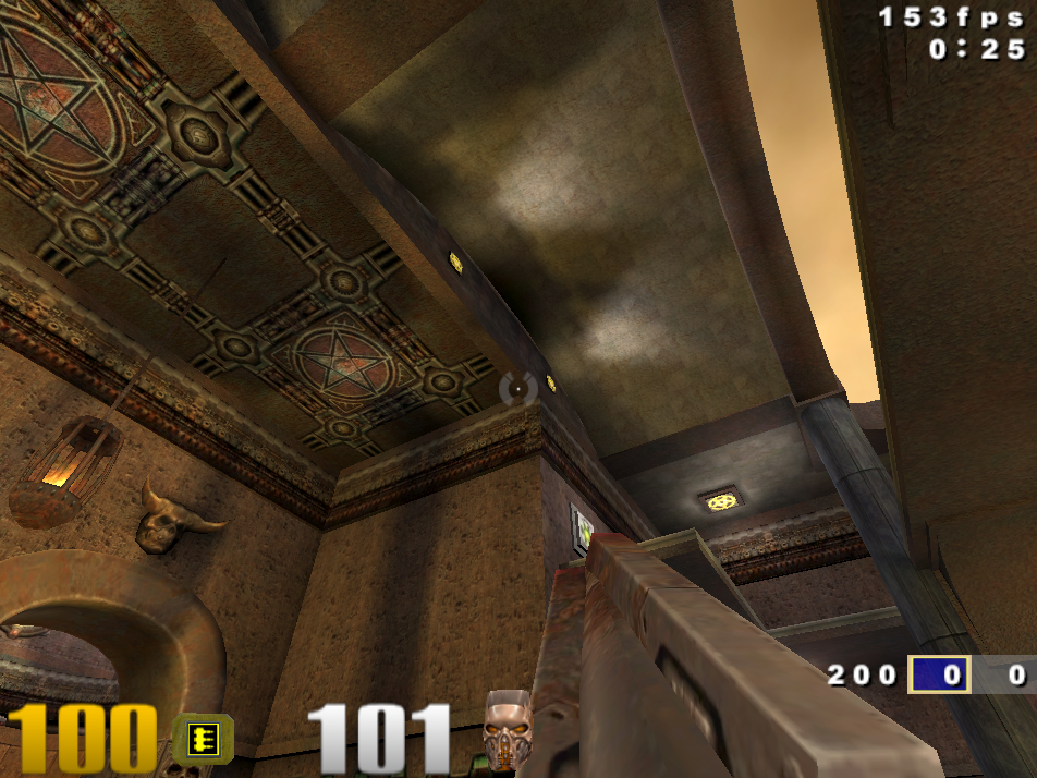 1) Statické povrchy mají  hybridní nasvětlení: v reálném čase pomocí Gouraud shading od statických světel (třebaže to není dobře viděž, protože se jedná o per-vertex lighting) a stínované jsou pomocí lighmapy. "Dynamická světla" alias pohyblivé světlé skvrny způsobují další lokální změny.