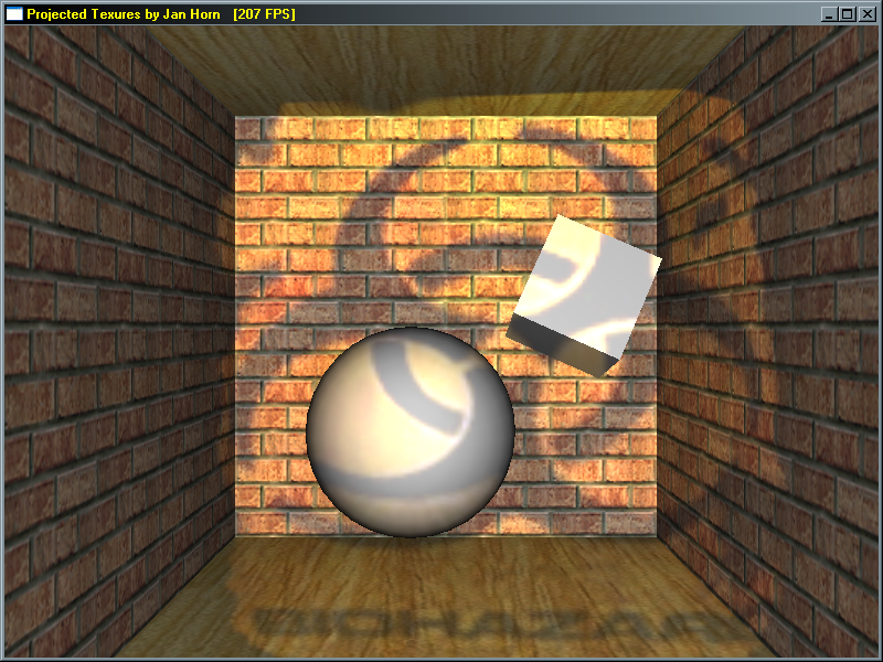 Per-pixel dynamická světla mají ješte jednu zajímavou vlastnost: dokáží s sebou nést jakoukoliv obrazovou informaci. Světelný zdroj je zkrátka možné použít jako projektor textury nebo videa, které se bude promítat na nejbližší povrch (ano bavíme se stále o světle uprostřed hry). Na screenshotu z dema AMP2 je možné tento efekt pozorovat na vzdálenější stěne - světelný zdroj má na sobě mřížku vytvořenou z textury. Této technice se říká projected textures. Myslím, že tímto způsobem bude řešená baterka v Doom 3, ale tady máme ješte jeden příklad: