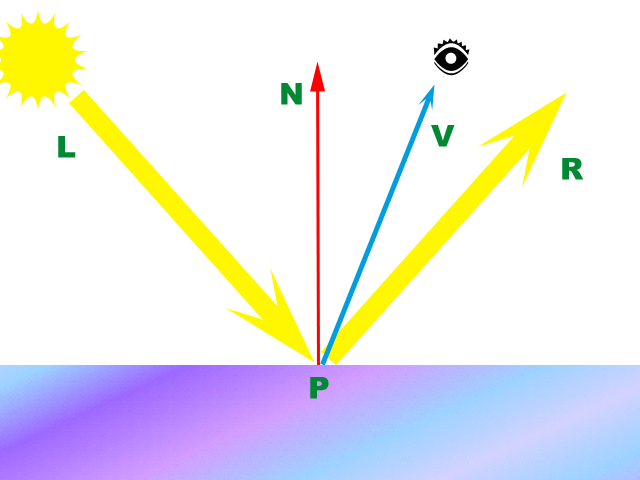 Celý specular lighting slouží k vytvoření iluze lesklého materiálu na základě zjednodušené fyziky. Matné materiály jsou charakteristické tím, že nejsou dokonalé hladké a světlo se na jejich povrchu rozptyluje všemi směry, zatímco na ideálně hladkém povrchu se jen odráží v závislosti na normálovém vektoru: